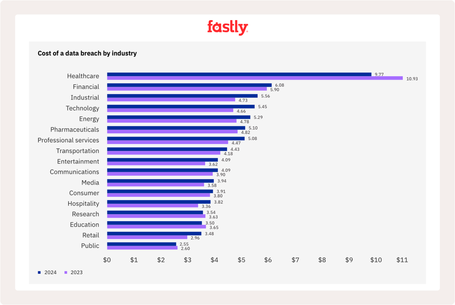 Healthcare remains a target for attackers since the industry often suffers from existing technologies and is highly vulnerable to disruption, which can put patient safety at stake. Source: Cost of Data Breach Report, 2024, IBM